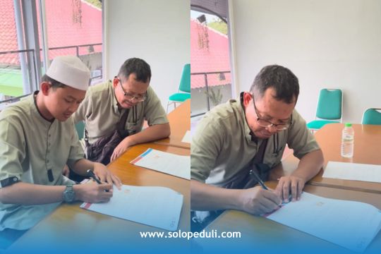 Fadli resmi menerima Beasiswa Ikatan Dinas Perguruan Tinggi Yayasan Solopeduli Ummat, setelah melalui proses penandatanganan Memorandum of Understanding (MoU) bersama orang tuanya, Didi Supomo, di Ruang Rapat II Kantor Pusat SOLOPEDULI, Karanganyar, pada Senin (22/09/2025) bersama Tim Program Solopeduli.